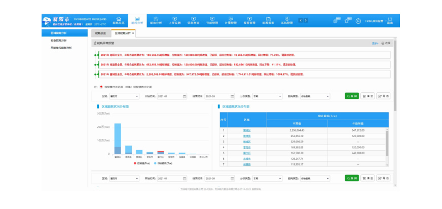 包括区域能耗分析、行业能耗分析和用能单位能耗分析3个子功能模块。可以从区域、行业和用能单位三个维度进行能耗统计与分析,能直观反映区域、行业和用能单位的能耗总量、趋势以及能耗异常。