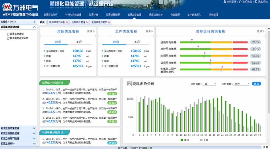 1、综合展示全厂主要能源使用量、主要产品产量、主要指标等能源管理关键信息的运行情况及变化趋势,让领导层对全厂的生产能源管理运行情况有整体、清晰的把握,为领导决策提供依据。